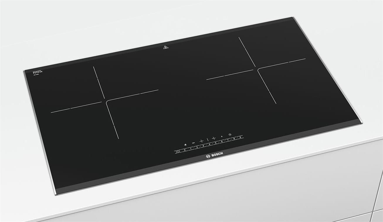 Mặt trước và mặt sau Bếp từ Bosch được thiết kế vát cạnh, hai bên viền bo nhôm. Mặt bếp Bosch PPI 82560MS làm bằng gốm thủy tinh Schott Ceran cao cấp siêu bền, chịu lực va đập tốt, chống trầy xước, chịu nhiệt lên đến 750 độ C