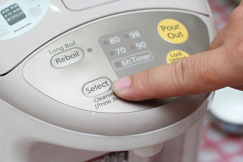 Khi bình thủy điện sử dụng lâu ngày bị đóng cặn. Để tẩy cặn cho bình thủy điện: cho acid citric (mua ở tiệm thuốc) và nước vào, nhấn nút “Select” trong 3 giây, để bình đun sôi nước. Hết thời gian, rút điện, để bình nguội, đổ nước ra và vệ sinh bình.