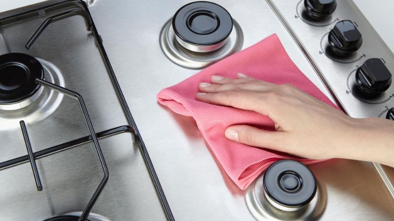 Để loại bỏ vết dầu mỡ trên thiết bị inox, cho vào bình xịt giấm trắng pha cùng nước ấm và vài giọt nước rửa chén. Sau đó xịt lên những vết dầu mỡ bám trên bề mặt inox rồi lau qua bằng khăn khô.