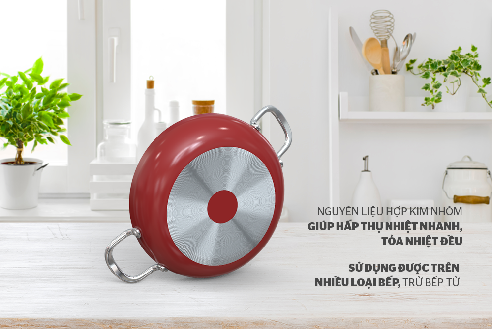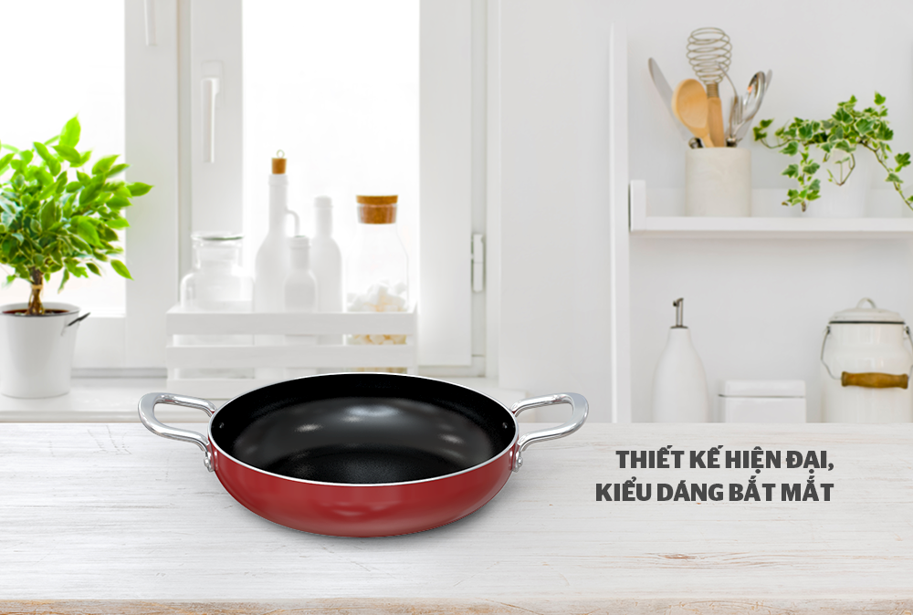 Vỏ ngoài chảo được sơn một lớp chịu nhiệt màu đỏ mận, chống bám bụi, hạn chế trầy xước, dễ dàng vệ sinh, tăng thẩm mỹ cho chảo.