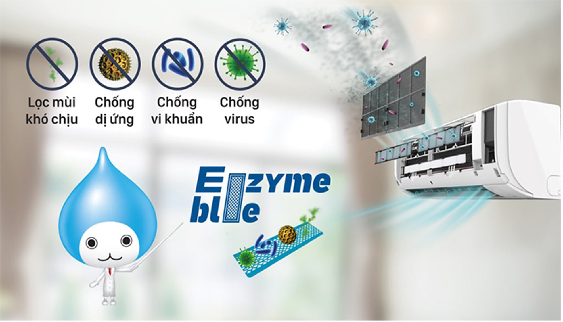 Phin lọc Enzyme Blue là một trong những công nghệ độc quyền của daikin. Công nghệ này có khả năng có thể loại bỏ hơn 90% mùi hôi trong vòng 1 giờ, giúp ngăn ngừa dị ứng hiệu quả.