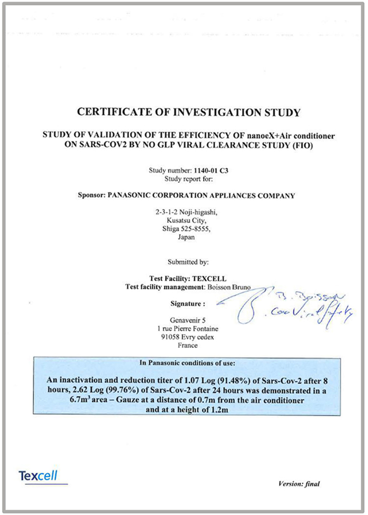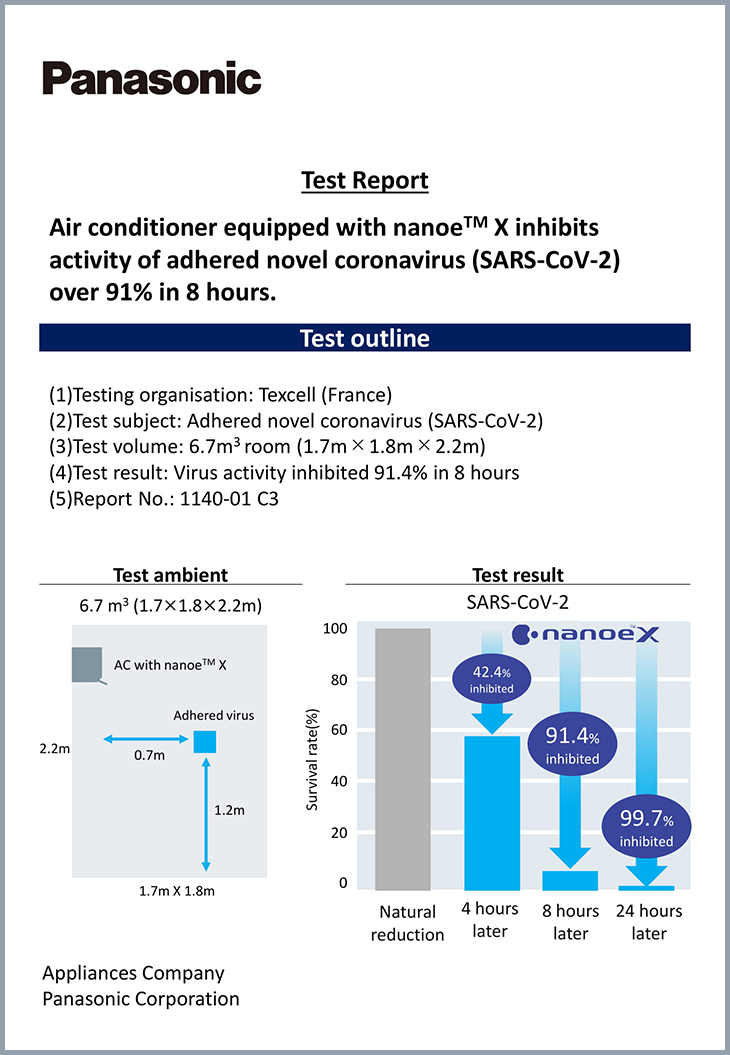 Panasonic cùng tổ chức Texcell (đây là một tổ chức nghiên cứu toàn cầu, chuyên thử nghiệm về virut) đã cho ra kết quả thử nghiệm rằng công nghệ Nanoe X có khả năng ức chế 91.4% khả năng hoạt động của virut Corona trong không gian kín 6.7 m3 nếu bạn bật điều hòa trong vòng 8 giờ. Thử nghiệm này được thực hiện trong điều kiện phòng thí nghiệm kín, không được thiết kế để đánh giá trong không gian sống không được kiểm soát.
