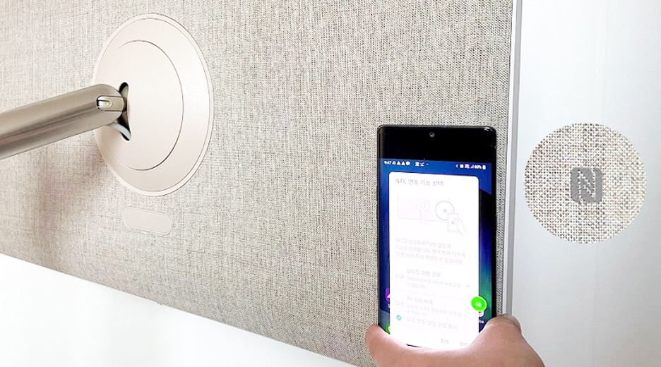 Bật NFC trên điện thoại di động và chạm nhẹ vào logo NFC ở mặt sau của tivi để truyền tải nội dung từ điện thoại lên tivi và sau đó bạn tha hồ nghe, xem các chương trình yêu thích trên màn hình lớn.