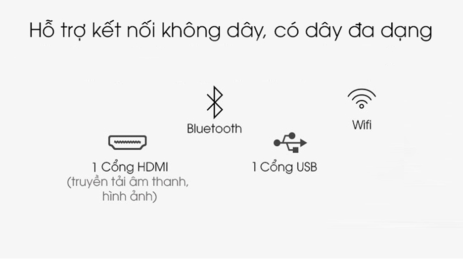 Thiết kế có thể kết nối rảnh tay với điện thoại qua Bluetooth, Wifi hoặc phối ghép có dây thông qua cổng HDMI, USB để nghe nhạc, xem phim, hình ảnh thuận tiện.