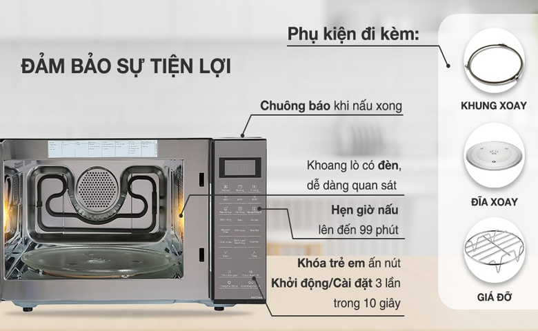 - Lò có âm thanh báo khi nấu xong, giúp người dùng có thể chủ động làm các công việc khác trong quá trình nấu ăn mà không lo thức ăn bị cháy khét.