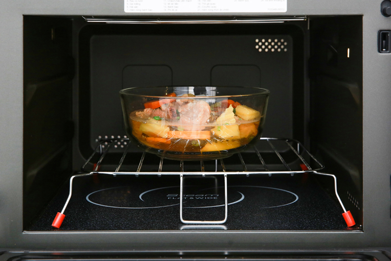 Đa chức năng nấu tiện lợi: hâm nóng, nấu, rã đông, hấp tự động với công suất vi sóng 1000W, chức năng nướng với khay nướng thạch anh cho công suất đến 1200W nướng ngon và an toàn