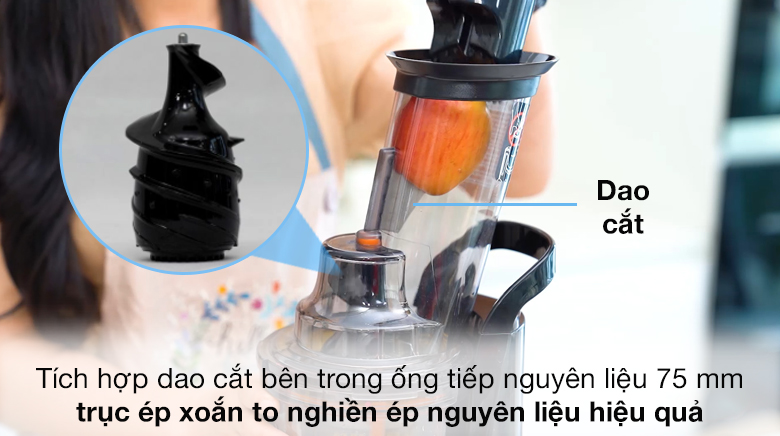Tích hợp dao cắt bên trong ống tiếp nguyên liệu, khi thả trái cây vào lưỡi dao sẵn sàng cắt nhỏ giúp dễ ép và ép nhanh hơn.