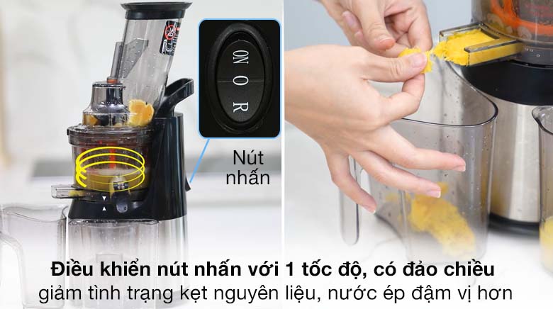 Điều khiển nút nhấn với 1 tốc độ, có đảo chiều, giảm tình trạng kẹt nguyên liệu, nước ép đậm vị hơn
