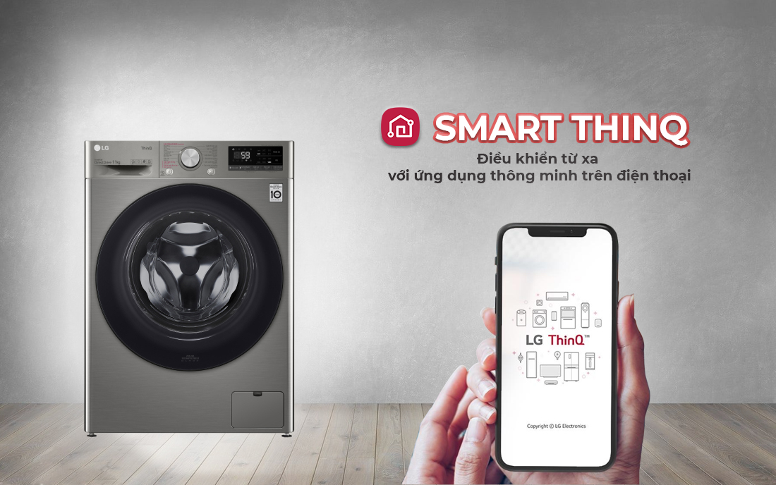 Điều khiển từ xa trên điện thoại di động bằng ứng dụng Smart ThinQ hỗ trợ cài đặt chương trình giặt phù hợp đồng thời hỗ trợ tính năng chẩn đoán thông minh giúp phát hiện lỗi thường gặp trên thiết bị.