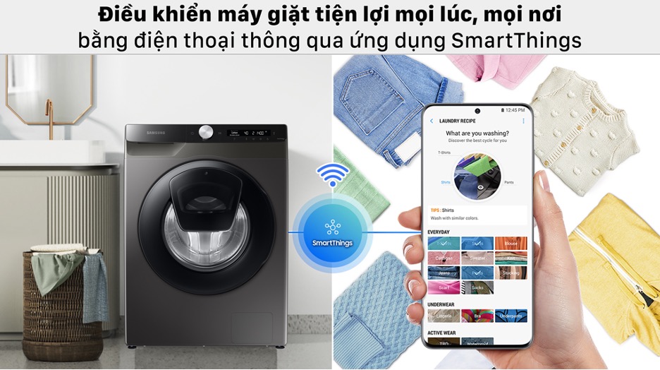 Việc giặt giũ sẽ dễ dàng hơn nhờ kết nối với smartphone thông qua ứng dụng SmartThings, cho phép bạn có thể theo dõi quá trình giặt cũng như điều khiển từ xa và đưa ra các gợi ý lựa chọn chương trình giặt dựa theo thói quen sử dụng mà không cần thiết lặp lại ở mỗi lần giặt.