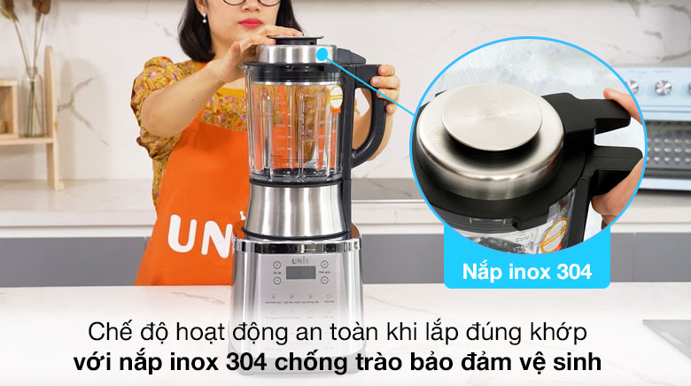 Chỉ khi cối xay được đóng nắp và lắp ráp đúng vị trí thì máy mới hoạt động, đảm bảo an toàn cho người dùng và bảo vệ tốt cho thiết bị, tăng tuổi thọ máy. Ngoài ra nắp cối còn làm bằng inox 304 đảm bảo an toàn trong vệ sinh thực phẩm, chống gỉ sét và đặc biệt có khả năng chống trào, giúp thực phẩm không bị tràn ra ngoài trong quá trình nấu.