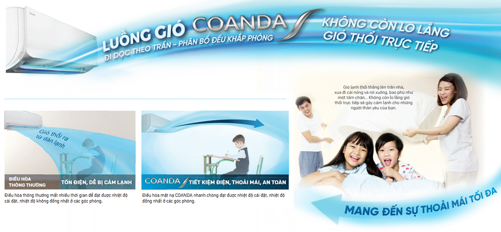 Ngoài ra, Coanda giúp luồng gió thổi xa đến 9m giúp mát lạnh đều khắp phòng, tiết kiệm điện năng, thoải mái và an toàn cho sức khỏe.