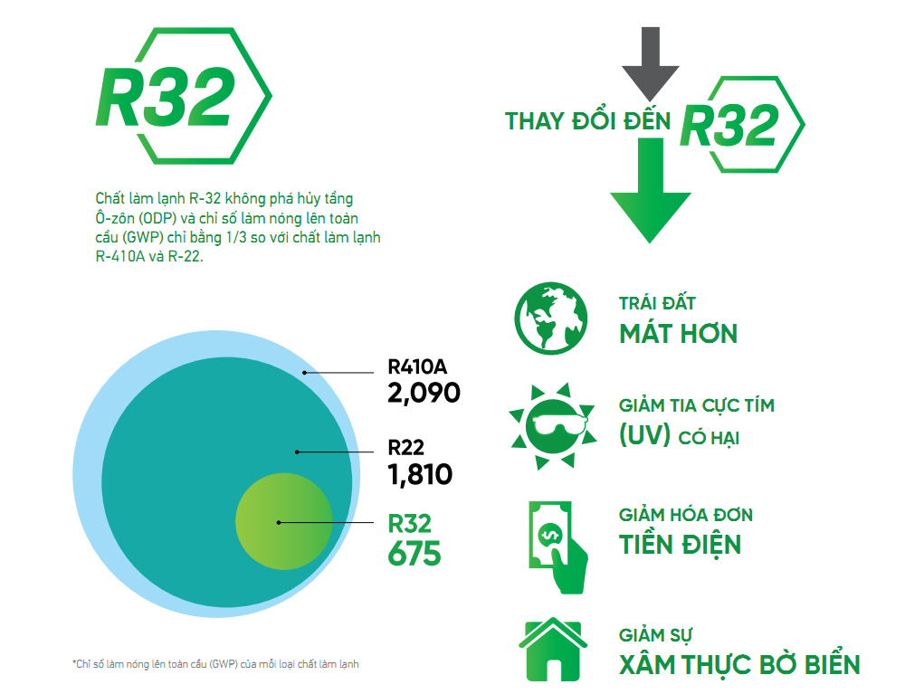 Chất làm lạnh R-32 không phá hủy tầng Ô-zôn (ODP) và chỉ số làm nóng lên toàn cầu (GWP) chỉ bằng 1/3 so với chất làm lạnh R-410A và R-22.