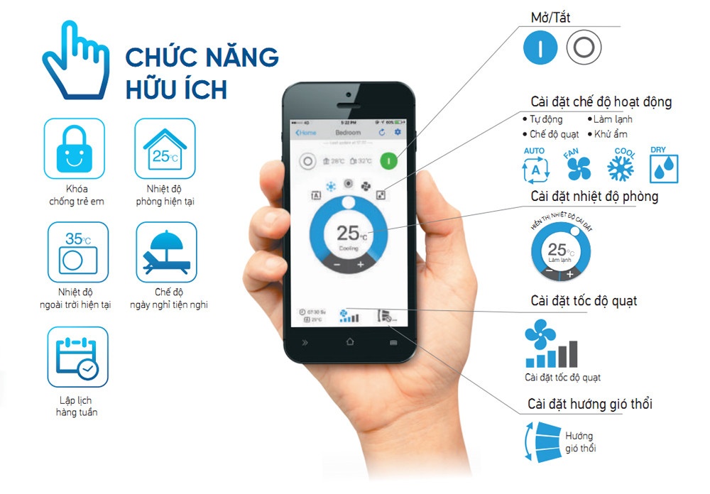 | Tốc độ quạt | 5 cấp, êm và tự động | ||