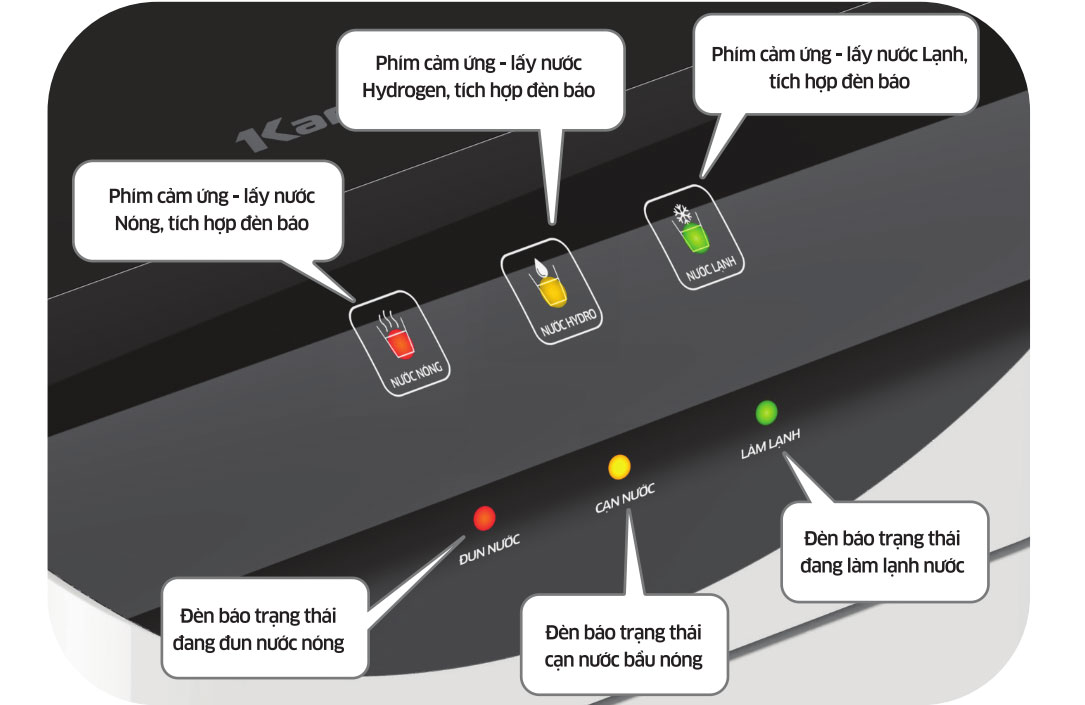 Đèn tại 3 chế độ sẽ sáng/không sáng khi bạn bật/tắt tùy chế độ. Bên cạnh đó, các đèn cảnh báo: Đèn báo trạng thái đang đun nước nóng, đèn báo cạn bầu nước nóng, đèn báo đang làm lạnh nước giúp bạn kiểm soát được hoạt động của máy dễ dàng.