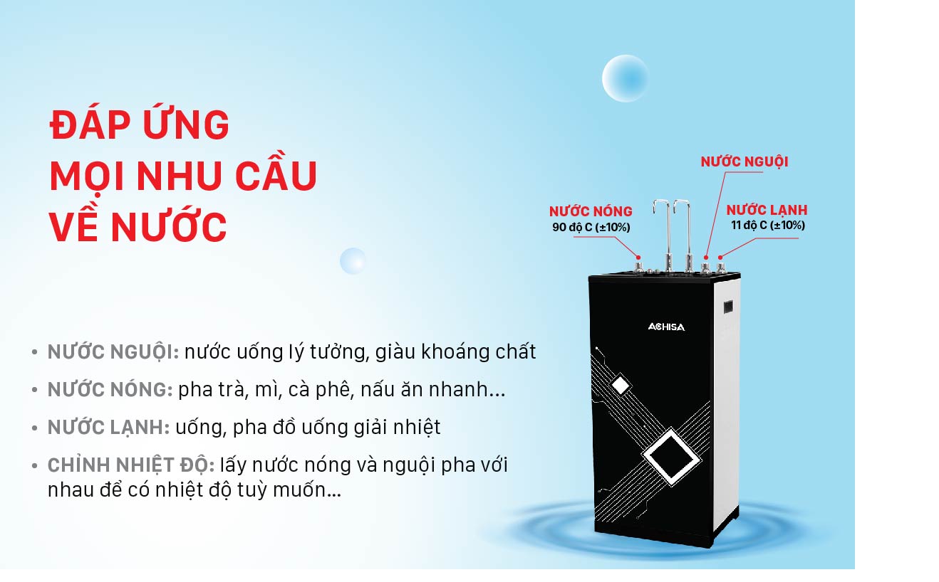 Trong tình trạng ô nhiễm nguồn nước báo động như hiện nay thì việc sắm cho gia đình một máy lọc nước RO nóng nguội lạnh Achisa ACW-32709H là hoàn toàn đúng đắn. Sản phẩm được trang bị hệ thống các cấp lọc tân tiến, giúp loại bỏ kim loại nặng, chất phù dù có hại cho sức khỏe.