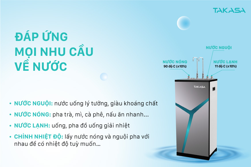 Thay vì chỉ sử dụng máy lọc nước với 1 chế độ nước thường, bạn có thể sử dụng máy lọc nước RO nóng nguội lạnh Takasa TAW-43710H với 3 chế độ nước: nóng - nguội - lạnh cho nhiều nhu cầu sử dụng khác nhau giúp tiết kiệm thời gian, công sức và chi phí cho người sử dụng.