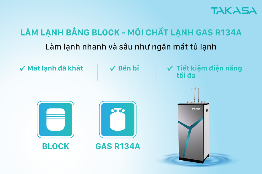 Takasa TAW-43710H với chế độ làm lạnh bằng công nghệ Block có khả năng cung cấp nước lạnh sâu xuống đến 11 độ C. Dù không cần thêm đá viên bạn đã có một ly nước giải nhiệt mùa hè siêu tiện và cực nhanh. Với công nghệ này, máy lọc nước rất thích hợp sử dụng ở những nơi có nhu cầu sử dụng cao như: văn phòng, trường học, bệnh viện,..