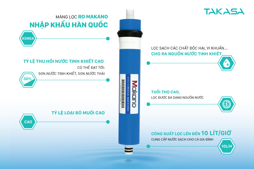 Màng lọc RO Makano: được nhập khẩu từ Hàn Quốc. Lõi hoạt động bằng cơ chế lọc thẩm thấu ngược, khe hở màng lọc RO rất nhỏ có kích thước khoảng 0.1-0.5 nanomet nên lọc đến 99.9% vi khuẩn, virus, cặn bẩn, các chất rắn, kim loại nặng... có trong nước cho ra nguồn nước tinh khiết.