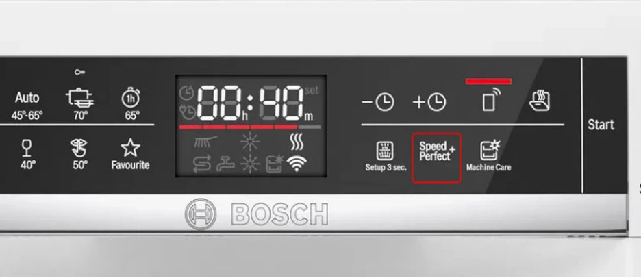 Bạn có thể sử dụng tính năng Speed Perfect + để rửa và làm khô bát đĩa hoàn toàn trong thời gian ngắn nhất. Chỉ cần chạm vào nút thì thời gian rửa có thể giảm tới 75% trong khi vẫn duy trì hiệu quả rửa. Chức năng Speed Perfect + có thể sử dụng được với bất kỳ chương trình rửa dài nào trên máy rửa bát Bosch HMH.SMU6ECS57E