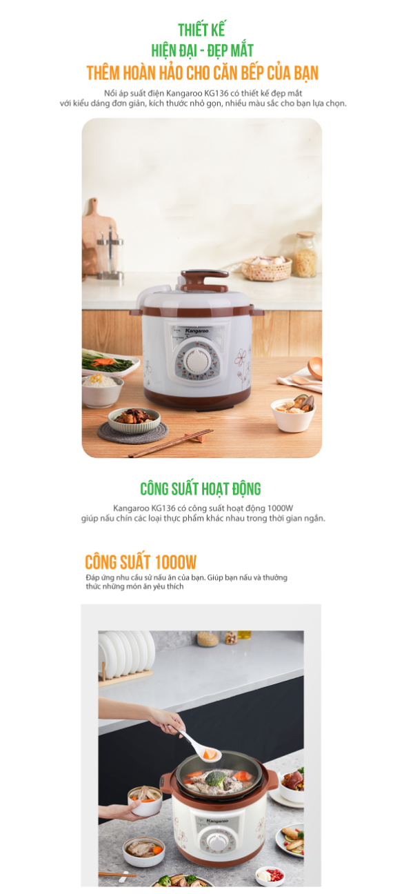 Nồi áp suất điện Kangaroo KG136 có thiết kế đẹp mắt với kiểu dáng đơn giản, kích thước nhỏ gọn, nhiều màu sắc cho bạn lựa chọn.