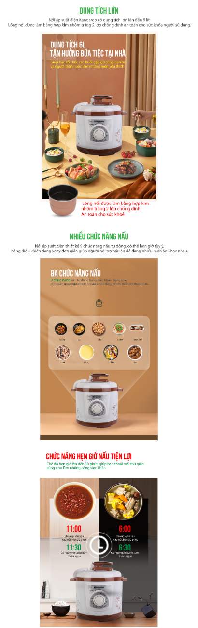 Nồi áp suất điện Kangaroo có dung tích lớn lên đến 6 lít. Lòng nồi được làm bằng hợp kim nhôm tráng 2 lớp chống dính an toàn cho sức khỏe người sử dụng.