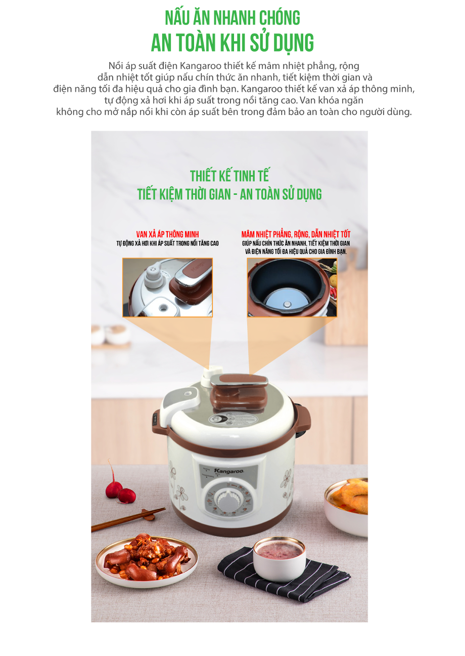 Kangaroo thiết kế van xả áp thông minh, tự động xả hơi khi áp suất trong nồi tăng cao. Van khóa ngăn không cho mở nắp nồi khi còn áp suất bên trong đảm bảo an toàn cho người dùng.