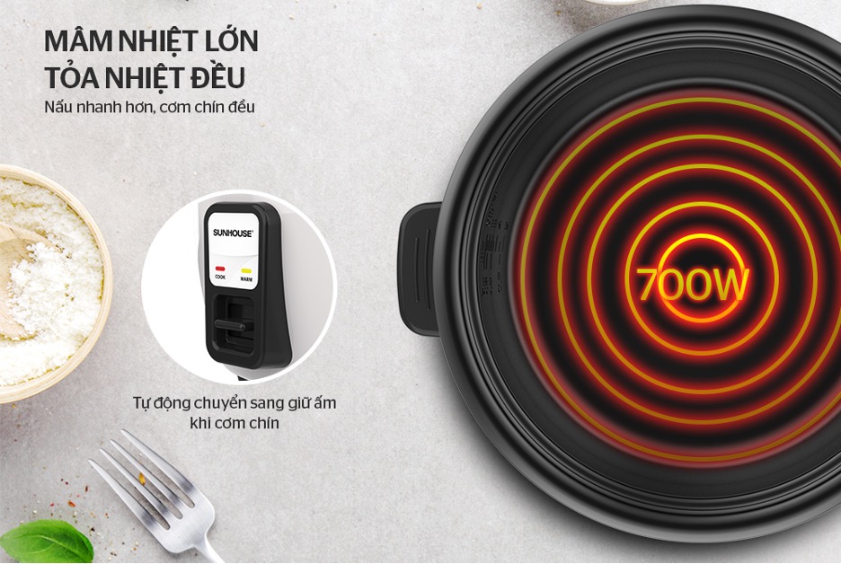 Nồi cơm điện SUNHOUSE SHD8132 được trang bị một mâm nhiệt lớn cùng công suất nồi 700W, nhiệt tỏa đều làm cơm chín nhanh và ngon hơn.