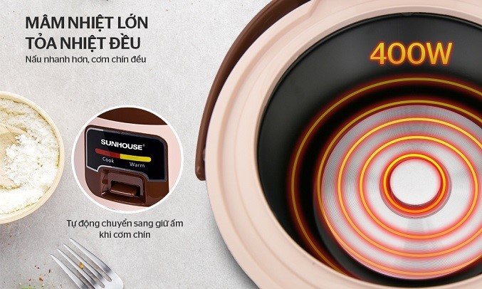 Nồi cơm điện Sunhouse 1 lít SHD8208C trang bị một mâm nhiệt lớn cùng công suất nồi 400W giúp nhiệt tỏa đều làm cơm chín đều, mềm và ngon hơn. Với dung tích 1 lít, chiếc nồi cơm điện này thích hợp sử dụng cho gia đình có khoảng 2 - 4 người hoặc các bạn học sinh, sinh viên.