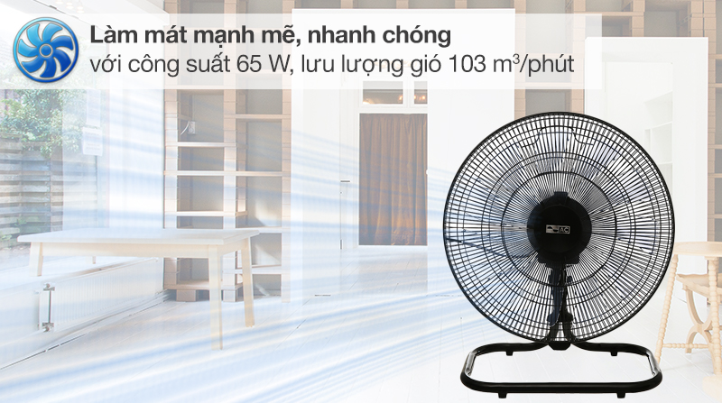 Quạt sàn AC được thiết kế với công suất hoạt động 65W, đạt lưu lượng gió lên đến 103 m3/phút, mang đến luồng gió thổi mạnh mẽ và làm mát phòng nhanh chóng.