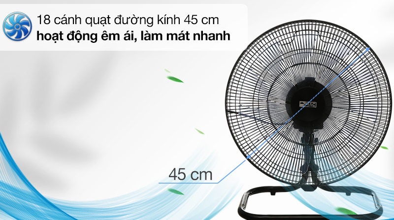Quạt được thiết kế với 18 cánh quạt đường kính 45 cm, hoạt động êm ái, sẽ không gây ngợp, khó chịu khi ngồi gần, vừa mang đến không gian yên tĩnh, vừa làm mát mạnh mẽ và nhanh chóng.
