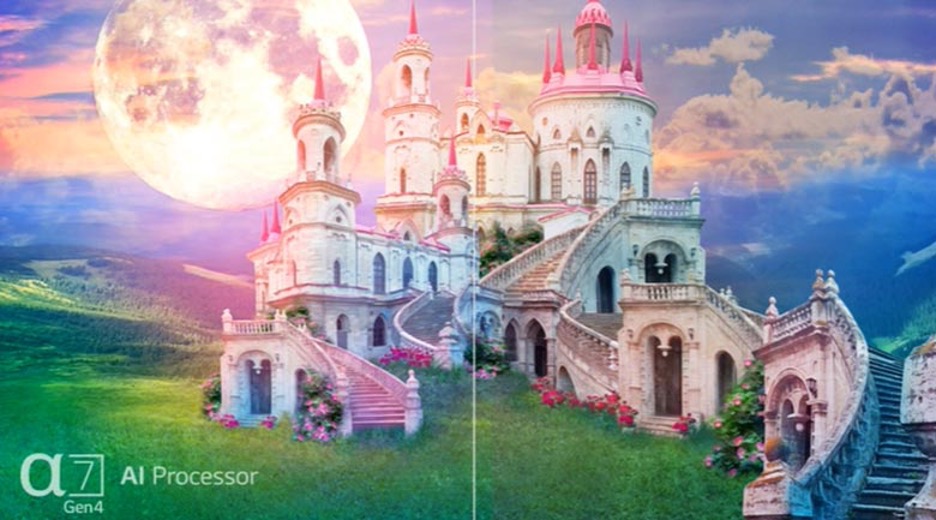Con chip α7 Gen4 AI 4K trên tivi LG có thể tự động điều chỉnh hình ảnh hiển thị dựa trên thuật toán chuyên sâu về các yếu tố màu sắc, độ tương phản, độ nét, độ sáng, chất nguồn vào của âm thanh và khả năng học hỏi từ những nội dung đã được chiếu trước đó để càng hoàn thiện hơn.