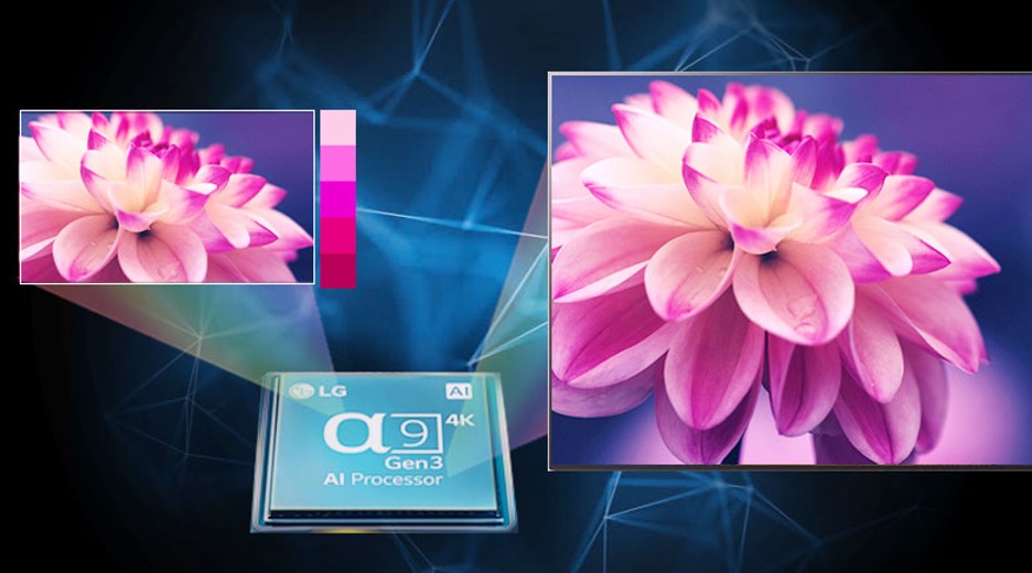 Smart tivi LG sở hữu bộ xử lý thông minh AI 4K α9 thế hệ thứ 3 có khả năng tự động phân tích nội dung, giảm nhiễu, tăng độ tương phản, tăng cường độ sắc nét dựa trên tần số đáp ứng tín hiệu từ nội dung độ phân giải thấp hơn, hỗ trợ tối ưu âm thanh cho chất lượng hình ảnh.