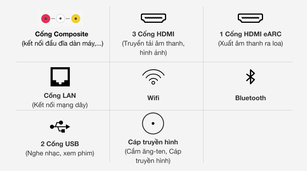 - Cổng nhận hình ảnh, âm thanh: 4 cổng HDMI có 1 cổng HDMI eARC (ARC), 1 cổng Composite
