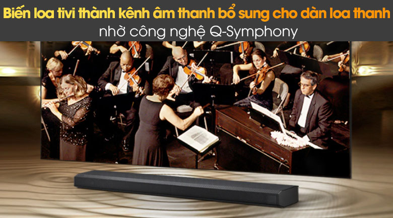 Q Symphony liên kết âm thanh các loa TV với loa thanh giúp tối ưu công suất loa, cho âm thanh phát ra mạnh mẽ vang dội cả căn phòng.