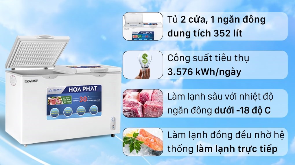 Tủ đông Hòa Phát 400l HCF 666S1Đ2 là tủ đông cỡ vừa, dung tích tổng thể: 400 lít; dung tích sử dụng 352 lít, 1 ngăn đông