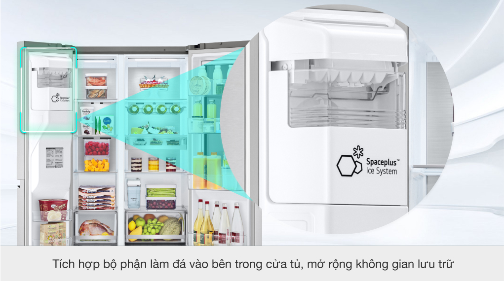 - Hệ thống làm đá tinh gọn SpacePlus™ trên cánh cửa tủ giúp tiết kiệm diện tích.