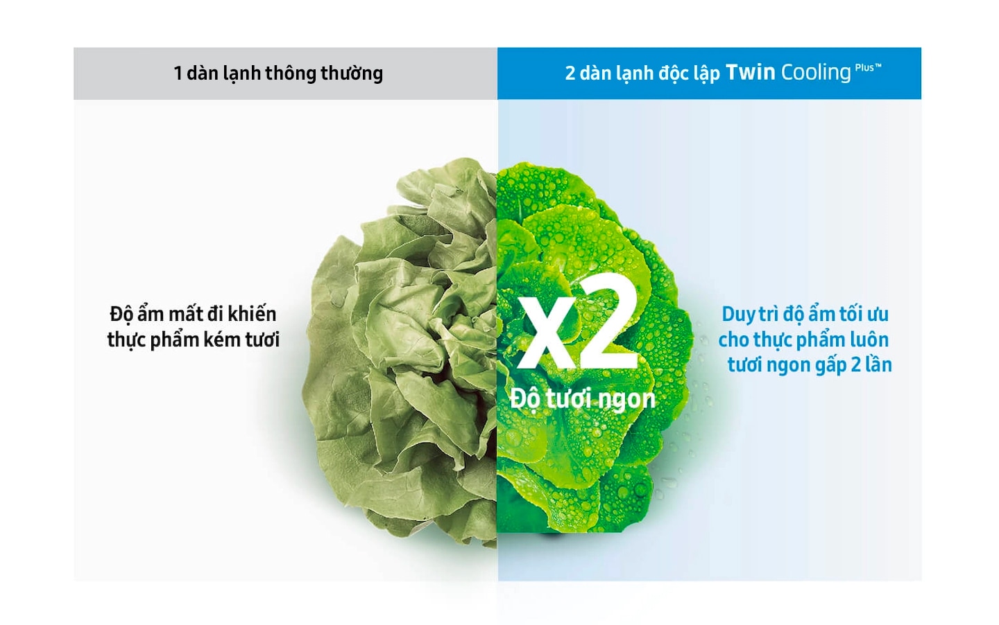 Tủ lạnh Samsung với 2 dàn lạnh độc lập Twin Cooling Plus™ ở ngăn đông và ngăn mát, có khả năng giữ độ ẩm gấp 3 lần so với tủ lạnh 1 dàn lạnh thông thường. Giờ đây, thực phẩm của bạn sẽ được bảo quản tươi ngon lâu hơn và không bị khô héo.