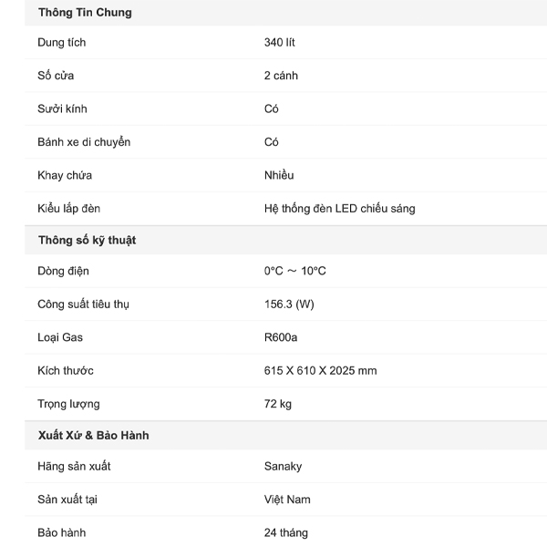 - Sở hữu dung tích 340 lít, phù hợp cho việc bảo quản thực phẩm của các hộ gia đình bán tạp hóa nhỏ, cửa hàng tiện lợi,...